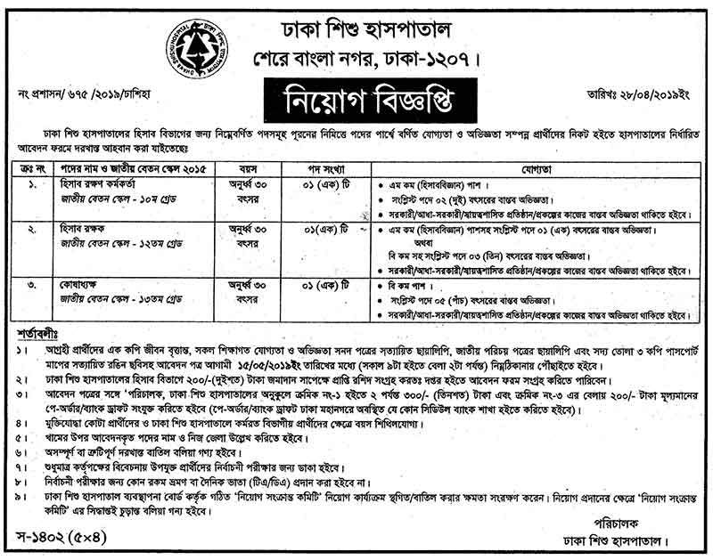 ঢাকা শিশু হাঁসপাতাল এ নিয়োগ বিজ্ঞপ্তি ২০১৯ –Dhaka Children Hospital;s job circular 2019