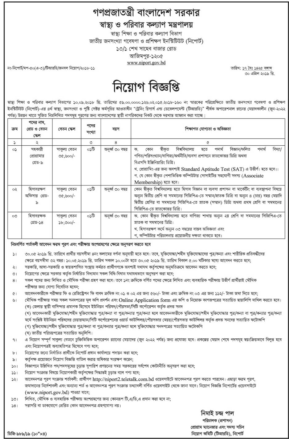 বিজ্ঞপ্তি প্রকাশের তারিখ –৩০ এপ্রিল ২০১৯